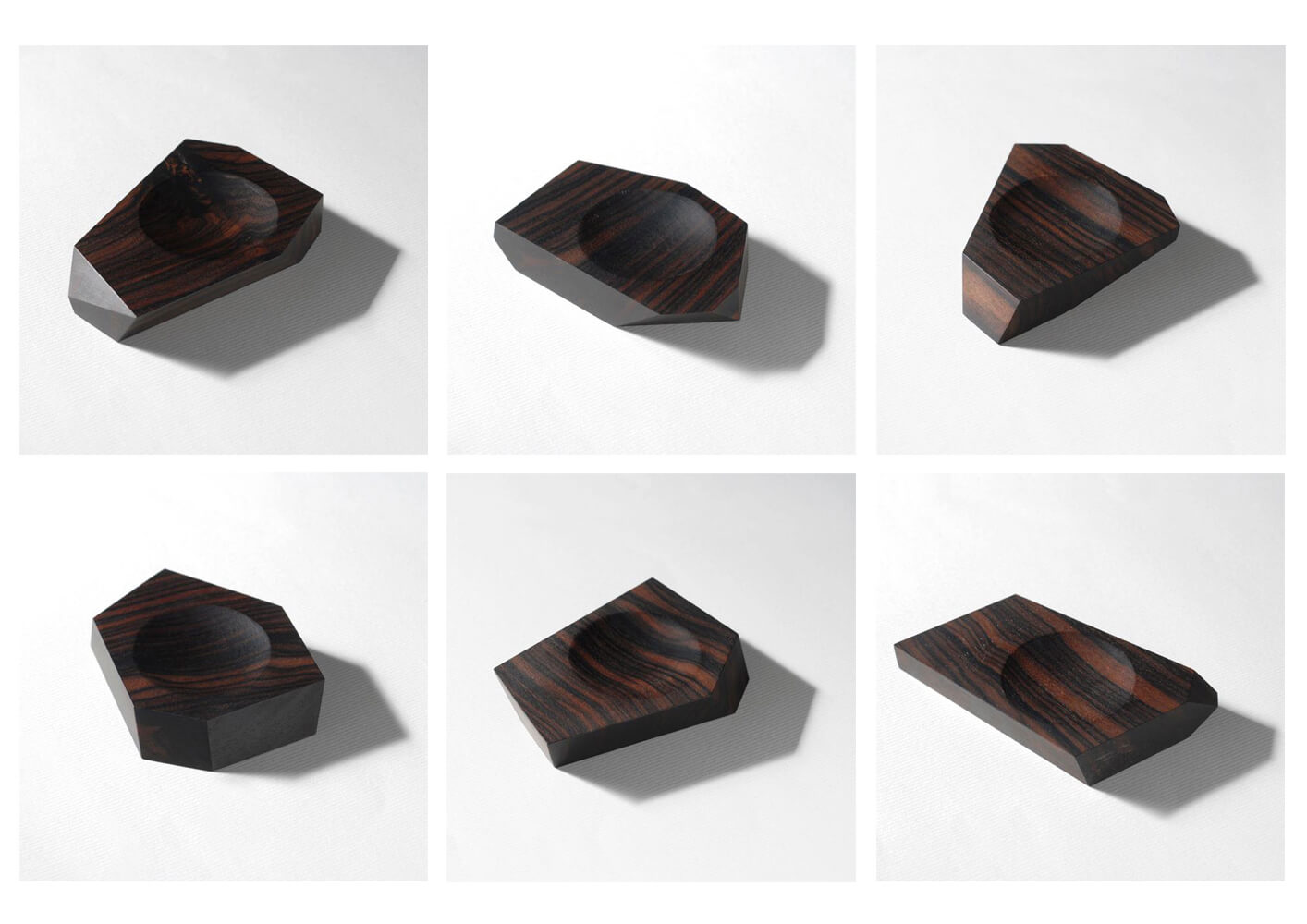 We designed original small plates from ebony for a bar. After creating various mock-up samples, we collaborated with the client to finalize the design. The hardness of ebony enabled us to create sharp edges, resulting in a sculptural piece inspired by the Twelve Divine Beings.
