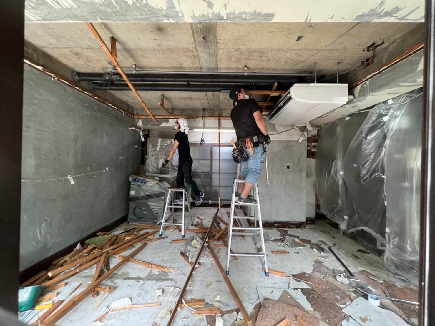 解体工事中の様子。天井や壁の中を通る配管が現れてきました。